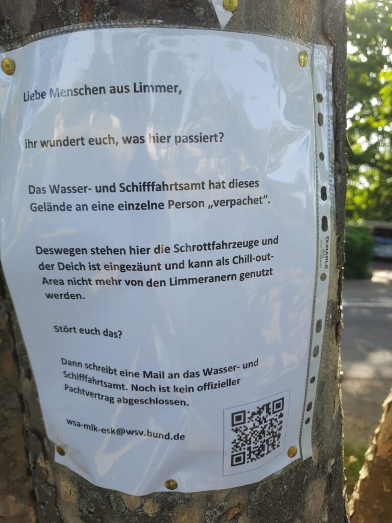 Offensichtlich hat die Wasser- und Schifffahrtsgesellschaft den beliebten Badebereich zwischen Limmer Schleuse und Mitte der Dieselstraße an einen Unternehmer verpachtet, wie ein Aushang zeigt. Er ruft auf, Protestmails an wsa-mlk-esk@wsv.bund.de zu schicken.