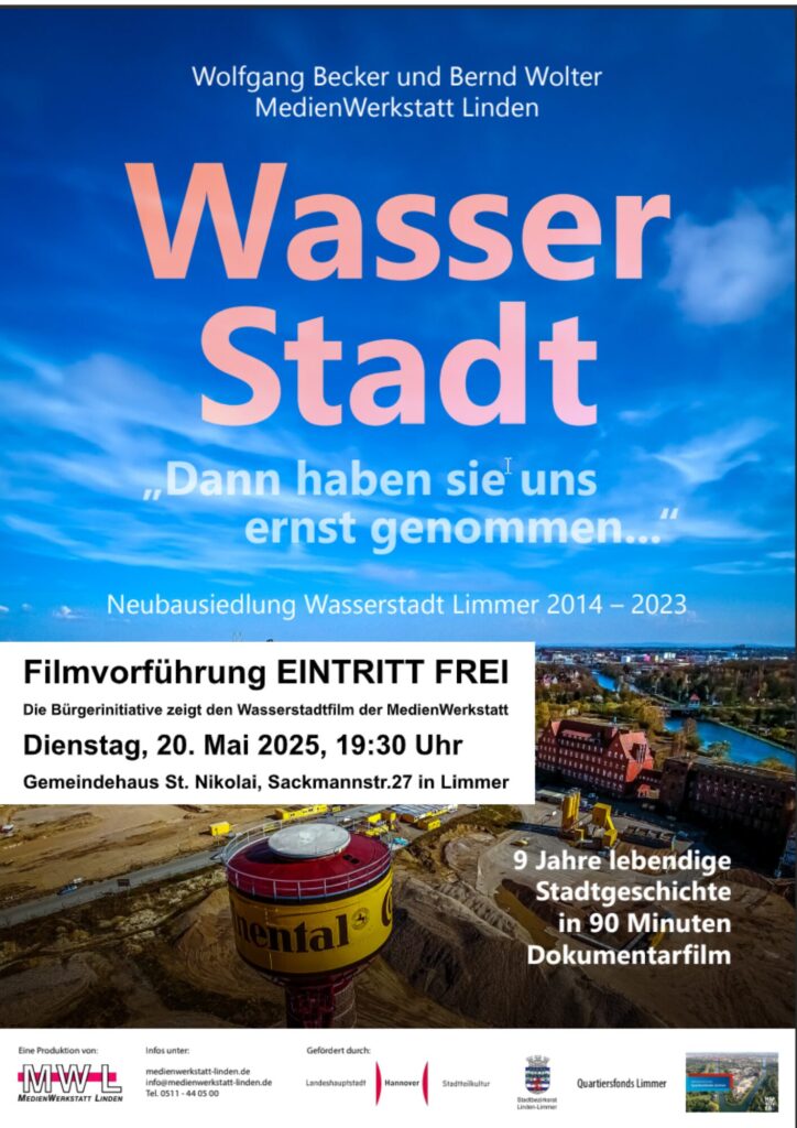 Dienstag, 20. Mai 2025, 19:30 Uhr, Gemeindehaus St. Nikolai, Sackmannstr.27 in Limmer: Wasserstadtfilm „Dann haben sie uns ernst genommen“.
